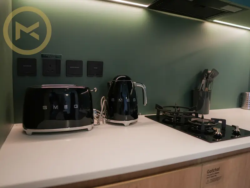 Features: Mobile app for room management & community information. One Parking Space. Plenty of natural light. Walk-in shower. Community Hub: Coworking Hub, Hangout, Social Kitchen, meeting room, gym, pool, garden, and sports court.
